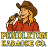 Illustration of a smiling woman wearing a cowboy hat and red shirt, holding a microphone, with the text 'Pendleton Karaoke Co.' below her.